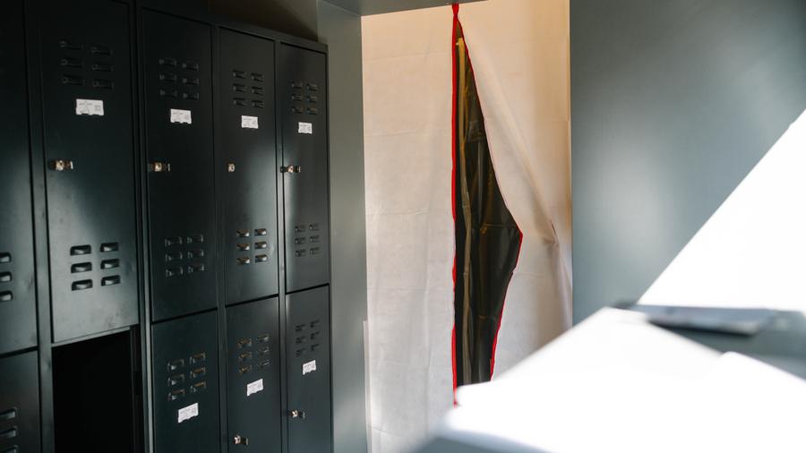Nach der Schadensaufnahme erfolgte zunächst der Rückbau der betroffenen Bauteile, gefolgt von der Installation einer technischen Trocknung, die insbesondere Estrich, Dämmschicht, Wände und Decken betraf. Diese Phase dauerte etwa zwei Wochen. Anschließend wurden die Flächen vollständig getrocknet, desinfiziert und der Ursprungszustand der Umkleide- und Duschbereiche wiederhergestellt. Insgesamt konnte das Projekt innerhalb von drei Wochen abgeschlossen werden – schnell, gründlich und ohne Beeinträchtigung des laufenden Studio‑Betriebs.