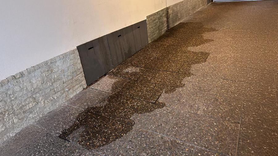 Es trat in den Duschbereichen der Herren- und Damenumkleiden durch defekte Siphons Wasser in unbestimmter Menge aus. Die Folge war eine deutliche Durchfeuchtung von Wänden, Decken und Fußböden. Im Bereich unterhalb der Duschen hatte sich bereits Schimmel gebildet. Feuchtigkeitsmessungen belegten die Ausdehnung des Schadens: